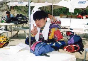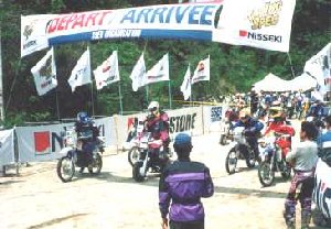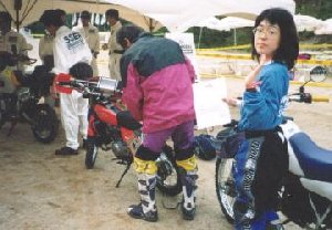 そうこうしているうちにスタートの時間となる。まず、アドベンチャークラス(50cc)から一台づつ30秒間隔でスタート。スタートしてすぐにお待ちかねの絶叫ヒルクライム。果敢にアタックする50ccのバイクたち。モーDT50は縦にまくれて下まで落ちてくるしモンキーは登り始めて3メーターぐらいで止まっちゃうは見ている方はみんな拍手喝采の大喜び! でもそのうちなんだかんだ確か3台が自力で登りきり、ほかのアドベンチャークラスも助けあって登って行く。その後続いて普通のクラス(もっともアフリカ象とかBMWなんかも混じってますけど)もスタートし始めた。ん〜、今回は斜面自体が乾いているので9割がた一発で登頂に成功している。結局、ひみつ基地のメンバーは全員無事に初日の帝人SSをクリアできたのであった。めでたしめでたし。