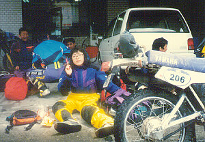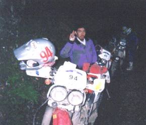 この日、朝のSSはキャンセルとなりその代わりゴール地点の美馬のモトクロスコースでエクストラSSが行われた。今日のSSは二本ともナイトランとなったのである。一本目で前述の「古谷さんナンバープレートブッとばし事件」に続き、二本目の美馬モトクロスランド特設コースでは好太郎クンがひっくり返りDT50をズルズルひきずっている間にサイレンサーの穴に泥を詰めてしまいエンジンがかからなくなってしまった。まさか泥がサイレンサーをふさいでるなんて暗闇の中でわかるわけもない。午前2時までかかりながら好太郎クンは2kmあまりのコースをズーッと押して奇跡の生還をとげたのである。ご苦労であった!この夜、私はラスト一日の為にタイヤを換えた。 |