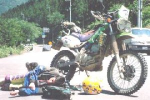 予定を少し遅れ最後のSSが始まった。ん〜たまらん! 丸太をあとから人為的に追加したけもの道、つづら折れのマディマディ急坂、片側崖のシングルトラック。鬱蒼と茂った樹木に日差しを遮られた地面はたっぷりと水分を含んだ山土だ。 アフリカ象がハマっている!そこをむりやりパスさせてもらい、ちょっと進むがその先も大渋滞。私ゃ新しいラインを開拓しようとチャレンジするがまんまとハマリ小池さんに助けられる。その先のつづら折れのマディマディ急坂を押して降りようとするが真っ暗プラスメガネが曇って何にもみえない! そんなこんなで3.40kmのSSを30分以上かけて走破した。 イヤー辛かった、でもスンゲー楽しかったぞ! 結局このSSはキャンセルとなってしまったけど、走りきったから良しとしよう。その後小池さんとコンボイで走り最後のゴールを目指す。途中の酒屋で一応、カンビールを買った。しばらく走るとルート上のパーキングにオフィシャルが居る。ここでエマージェンシー封筒を開封し最終ゴール地点に向かえと指示される。ゴール地点はスタートした奥道後温泉の近くらしい。