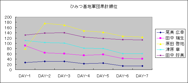 | 累計順位 | DAY-1 | DAY-2 | DAY-3 | DAY-4 | DAY-5 | DAY-6 | DAY-7 |