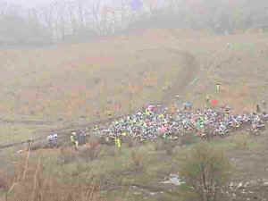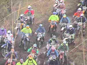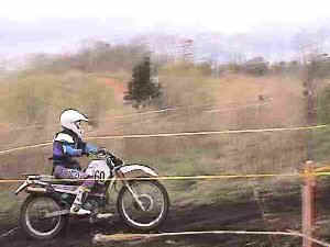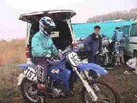雨はそう強くはない。しかし、好太郎クンがコースに出ると二度と帰って来れそうもないので、今日は私が全部走ることにする。 昨日と同じようにローリングスタート。しかし昨日と違って路面はマディ。いきなりスタートしてコケるライダーが続出。一周目は結構キツかった。スタート直後のダンゴ状態のおかげで絶叫下りで渋滞になり、スタンディングがとれず二輪二足で降りなきゃならんです。さらに絶叫の登りでもいたるところでライダーとマシンがコケまくっている。そんなところはヨーダさんと助け合いながら突破した。 それでも2周めに入るとみんなばらけてきてイイ感じで走れるようになってくる(昨日のXR600Rに続き、今日はフサベルを抜いたぞ!)途中薄日が射したりして雨はほとんどあがってきた。一ヶ所あるキツい登り以外は特にハマルことも無く、セローは順調に周回を重ねる。フルサイズのマシンがヒーヒーいっている横をバタバタと二輪二足でパスしていく。走っているバイクはあんまり抜けないけど、止まっているバイクはガンガン抜けるぜ?! 4周目もあと10分くらいでチェックポイントだという地点に来た。チェッカーまであと20分あるからもう一周できる! とか考えてるといきなり強い雨が降ってくる。そのときは全然気にしなかったけど、しばらくするといきなり走りにくくなった「???」ん〜なんだ〜これは! さっきまでなんでも無く登っていた坂が登れない、ちょっとした下りでいきなりコケル…。ストレートですぐマシンがヨコを向く…。「???お〜パンクか〜?!」でもタイヤを見るがパンクなんてしてない???? とりあえず倒れたマシンを何度もなんども起こしながら少しづつ先へ進む。いくつ目かの坂をやっとこさ登ったとき、ふとヨコを見るとコダマクンがハマっている。「お〜ドウダイ調子は?!」「イヤーだめです!」意味不明な会話を交わしながら、ヒーヒーお互いのバイクを押し進めつつチェッカーを目指す。