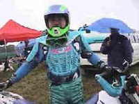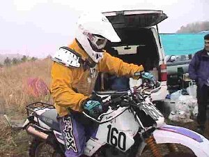 イヤ〜たのしいけど、これは疲れるコースです。アップダウンはいいとして、あとは全部路面がデコボコ(どこが北海道ダッ!)今日のコース状態なら、2ストハイパワーマシンが有利って感じです。コダマクン、Jun造クンの二人のWR250Zは快調に周回を重ねている模様。五味さんも頑張っているようです。しかし、浅野さんはウッズで木に激突してヘルメットをぐちゃぐちゃにしながらも走り続けている(後日病院にいったら肋骨3本バキバキだったらしい…)そしてヨーダさんはクラッチやっちゃってウッズでぼーぜんと立ちすくんでいるという情報が…。