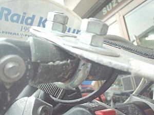マップホルダーを取りつけるベースは、2mm厚のアルミ板をU字の金具を使用してハンドルのブリッジに取り付けています。 ベースの板とマップホルダー本体は、マジックテープ&ゴムヒモで取付。 |