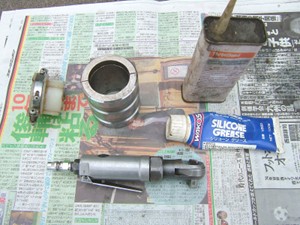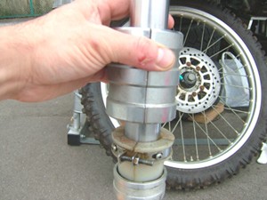 オイルシールを打ち込む為の特殊工具。 オイルシールには、ゴムにやさしいシリコングリスを使用します。 ネジロックは、アウターチューブ下部のボルトに塗布します。 そのボルトをエアラチェットで締めます。 あと、フォークオイルのレベルを見るためには、ワリバシにしるしをつけたものを使用しています。 今回の油面は、165mm。 |