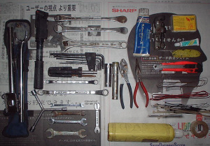 工具一覧: ワンアップスタンド、空気入れ、タイヤレバー×2、モンキーレンチ、六角レンチ、ドライバー(差し替え式)、メガメレンチ(8×10.12×14)、三つ又レンチ(8.9.10)、スパナ(6×7.8×10.10×12.14×17)、ニップルレンチ、プラグレンチ(C用、D用)、プライヤー、ニッパー、グリース、パッチセット、液体ガスケット、エポキシパテ、チェーンカッター、カッター、ハリガネ、リード線、タイラップ、ビニールテープ、ガムテープ、黄色容器にはエンジンオイルの廃油をいれておく(チェーンオイルとして使用)。