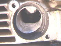 パワーアップさせるポイントは、まず排気ポートを拡大し排気効率をアップさせること。なぜか異様にここが狭いんですネ、このエンジン。 初めてここをいじったときには、「この狭い排気ポートは何か深い意味があって、あえてこんな形状になっているのか??」 |