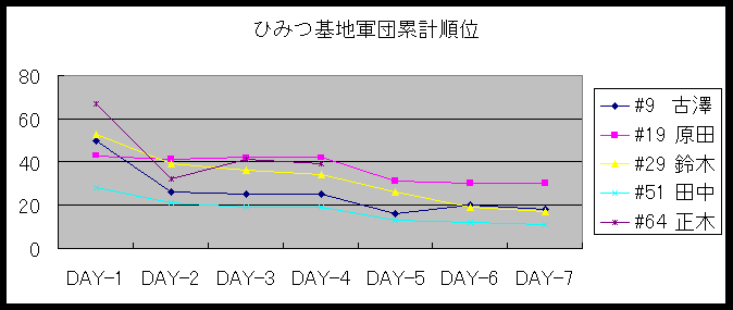 ひみつ基地軍団の各SSでのリザルトを比較してみました。面白いのがSS-2の結果です。 SS-4田中の35位は、ガレ場の林道タイムアタックで大転倒。SS-10古澤選手、ガケからダイブして37位。とだいたいミスすると、ガクッと順位を落とします。 とまあ、このグラフをよーくみてると、TBIの何たるか、がわかります。 速く走ることより、ミスしないコトが重要なのです。 |